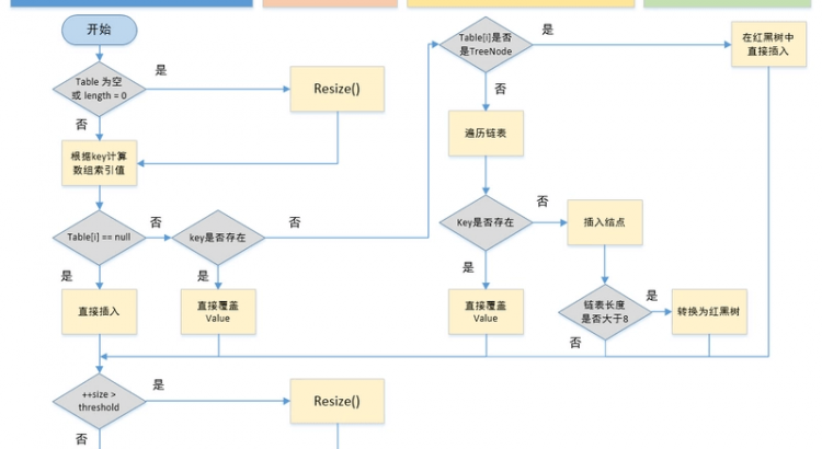 上面的判斷條件都不滿足,說明table[i]存儲的是一個鏈表,那麼遍歷鏈表,判斷是否存在已有元素的key與插入鍵值對的key相等,如果是,那麼更新value,如果沒有,那麼在鏈表末尾插入一個新節點。插入之後判斷鏈表長度是否大於8,大於8的話把鏈錶轉換為紅黑樹。