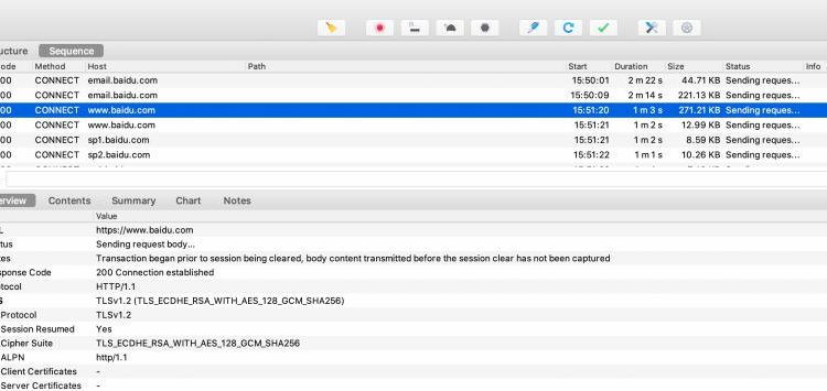 Proxy->Start Recording,打開瀏覽器訪問任意頁面,可以在Charles中看到請求了。