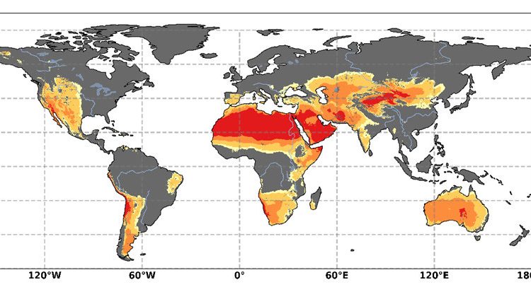 The term “drylands” encompasses parts of the world that are defined as dry sub-humid, semi-arid, arid or hyper-arid – indicated by the yellow, orange and red shading in the IPCC map below.