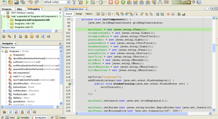 NetBeans調試器允許您在Java代碼中放置斷點,運行方法,添加字段監視,監視執行以及在調試會話期間拍攝快照。