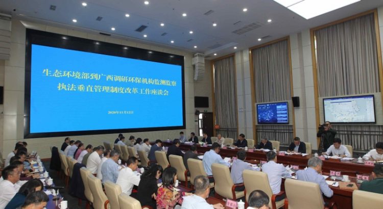 字號:[大] [中] [小] 11月12日,生態環境部黨組書記孫金龍赴廣西南寧,調研省以下環保機構監測監察執法垂直管理改革工作(以下簡稱環保垂改)情況。他強調,要深入學習貫徹十九屆五中全會精神,按照中央巡視反饋意見整改工作要求,紮實推進環保垂改任務如期落實落地,進一步釋放改革紅利,助力“十四五”生態環境保護工作開好局、起好步。 孫金龍先後來到南寧市生態環境局、自治區生態環境廳主持召開座談會,分別聽取自治區、市、縣三級生態環境部門監測監察執法垂直管理改革落實情況的彙報。座談會上,大家總結了改革落實過程中的好做法好經驗,
